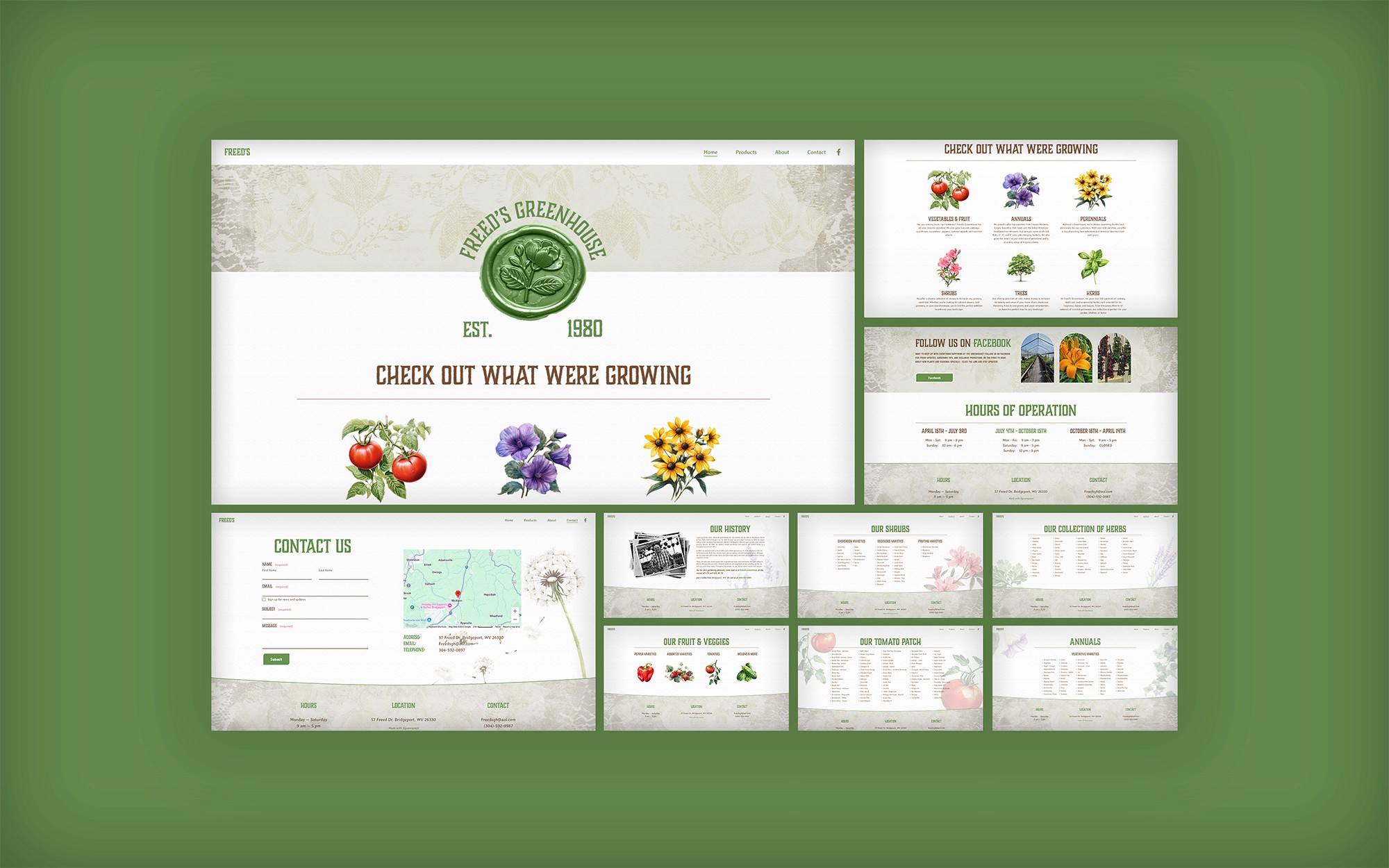 Freed’s Greenhouse, a family-owned business with deep community roots, needed a refreshed online presence that reflected the warmth and trust they’d built locally. I led the redesign of their website and developed a visual identity that combined handcrafted charm with a polished, approachable feel. Using a soft green palette, floral patterns, and watercolor-inspired imagery, I created branding that feels inviting and authentic to their small-business character. I handled brand development, asset preparation, and responsive web design, resulting in a cohesive digital identity that highlighted their full range of products and services while staying true to their welcoming, community-driven spirit.